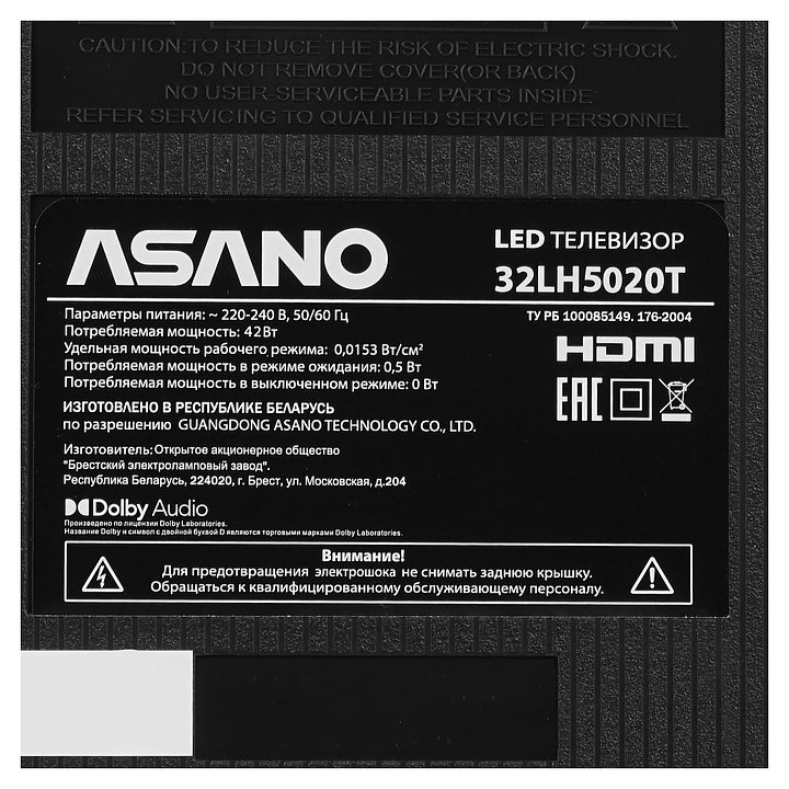 Телевизор Asano 32LH5020T предназначен для приема и воспроизведения видео и аудио контента с различных ресурсов таких как телевещание, Интернет, дополнительное подключаемое оборудование и физические носители в домашних условиях, гостиницах, офисах, холлах и кабинетах различных учреждений. Прибор оснащен плоским широкоформатным монитором, акустической стереосистемой с 2 встроенными динамиками, встроенным блоком питания, кабелем питания с вилкой и клавишами управления, пульт – кнопочной клавиатурой. Кожух прибора выполнен из ударопрочного полимера с матовой поверхностью черного цвета, рамка экрана и подставка с поверхностью черного цвета, корпус пульта – из черного пластика.