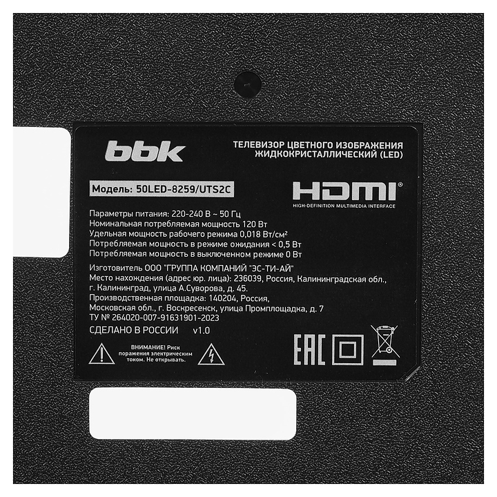 Телевизор BBK 50LED-8259/UTS2C предназначен для приема и воспроизведения видео и аудио контента с различных ресурсов таких как телевещание, Интернет, дополнительное подключаемое оборудование и физические носители в домашних условиях, гостиницах, офисах, холлах и кабинетах различных учреждений. Прибор оснащен плоским монитором, акустической стереосистемой с 4 встроенными динамиками, встроенным блоком питания, кабелем питания с вилкой и основным выключателем, пульт – кнопочной клавиатурой. Кожух прибора выполнен из ударопрочного полимера с матовой поверхностью черного цвета, рамка экрана и подставка с поверхностью черного цвета, корпус пульта – из черного пластика.
