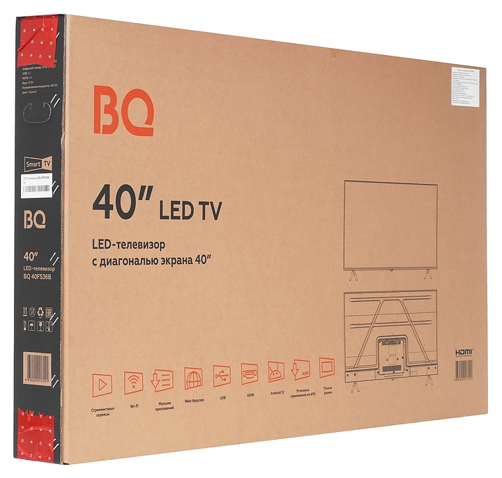 Телевизор BQ 40FS36B предназначен для приема и воспроизведения видео и аудио контента с различных ресурсов таких как телевещание, Интернет, дополнительное подключаемое оборудование и физические носители в домашних условиях, гостиницах, офисах, холлах и кабинетах различных учреждений. Прибор оснащен плоским широкоформатным монитором, акустической стереосистемой с 2 встроенными динамиками, встроенным блоком питания, кабелем питания с вилкой и основным выключателем, пульт – кнопочной клавиатурой. Кожух прибора выполнен из ударопрочного полимера с матовой поверхностью черного цвета, подставка – из металла с поверхностью черного цвета, корпус пульта – из черного пластика.