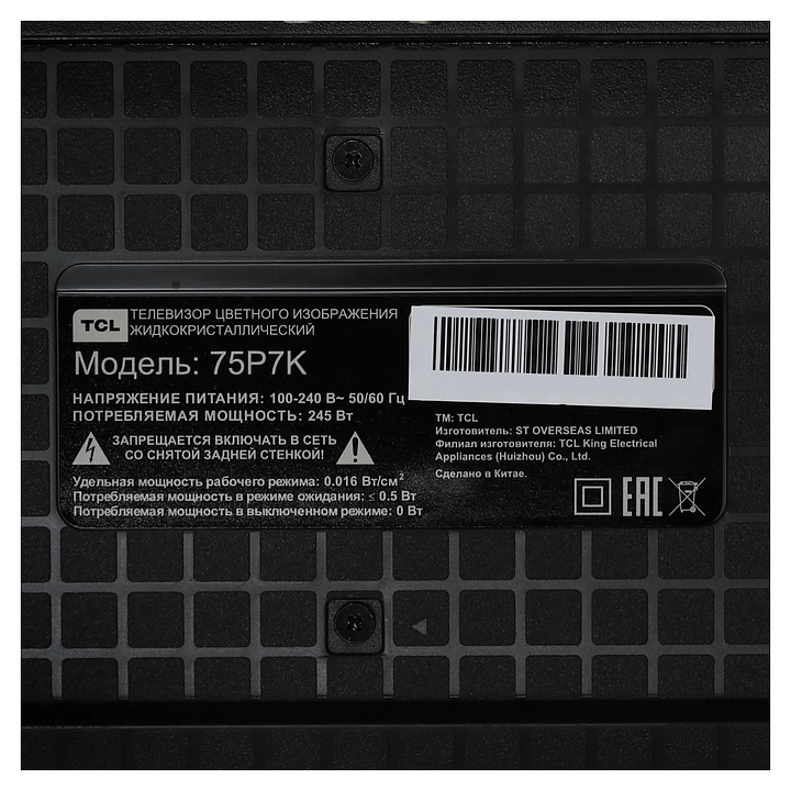 Телевизор TCL 75P7K предназначен для приема и воспроизведения видео и аудио контента с различных ресурсов таких как телевещание, Интернет, дополнительное подключаемое оборудование и физические носители в домашних условиях, гостиницах, офисах, холлах и кабинетах различных учреждений. Прибор оснащен широкоформатным плоским монитором, акустической стереосистемой с 2 встроенными динамиками, встроенным блоком питания и основным выключателем, пульт – кнопочной клавиатурой. Кожух прибора выполнен из ударопрочного полимера с матовой поверхностью черного цвета, рамка экрана – из металла, подставка с поверхностью черного цвета, корпус пульта – из черного пластика.