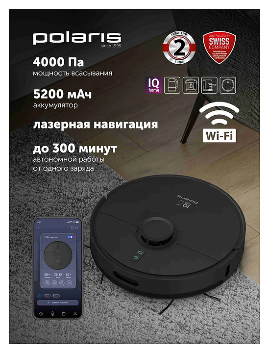 Умный робот пылесос Polaris PVCR 4500 WIFI IQ Home созданный для сухой, влажной и комбинированной уборки, обеспечивает идеальную чистоту в вашем доме. Благодаря высокоточной системе лазерной навигации, робот-пылесос с лидаром легко ориентируется в пространстве, избегает столкновений и запоминает до 3 карт помещений. Модель оснащена автоматической парковкой, регулятором мощности и управлением через приложение Polaris IQ Home на вашем смартфоне, а также голосовыми помощниками. В комплект входит пылесос, фильтр НЕРА 2 шт, губчатый фильтр, микрофибра 2 шт, 4 боковые щетки, щеточка для очистки, зарядная база, адаптер, инструкция. Особенности: