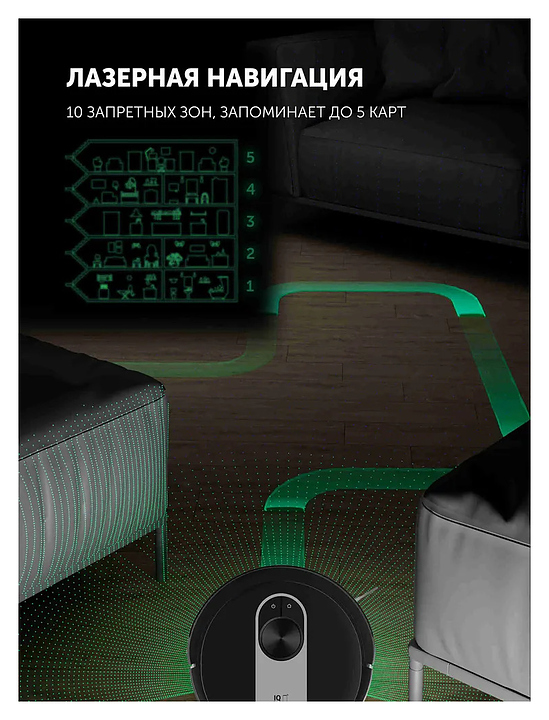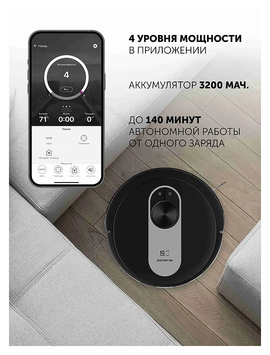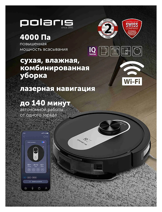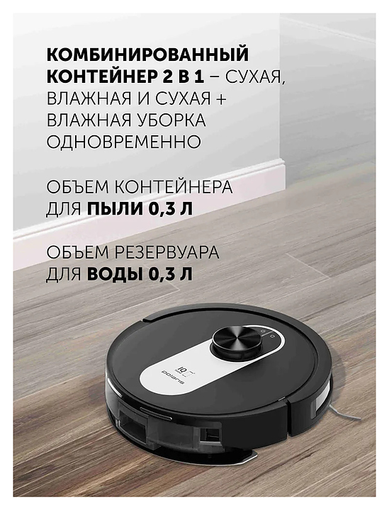 Умный робот пылесос Polaris PVCR 4250 WIFI IQ Home созданный для сухой, влажной и комбинированной уборки, обеспечивает идеальную чистоту в вашем доме. Благодаря высокоточной системе лазерной навигации, робот-пылесос с лидаром легко ориентируется в пространстве, избегает столкновений и запоминает до 5 карт помещений. Модель оснащена автоматической парковкой, регулятором мощности и управлением через приложение Polaris IQ Home на вашем смартфоне, а также голосовыми помощниками. В комплект входит прибор, фильтр НЕРА 2 шт, губчатый фильтр, микрофибра 2 шт, 2 боковые щетки, щеточка для очистки, зарядная база, адаптер, инструкция. Особенности: