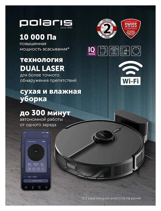 Умный робот пылесос Polaris PVCR 5005 WIFI IQ Home созданный для сухой, влажной и комбинированной уборки, обеспечивает идеальную чистоту в вашем доме. Устройство оснащено системой построения до 10 карт помещения и возможностью управления через смартфон, а также голосовыми помощниками. В комплект входит: