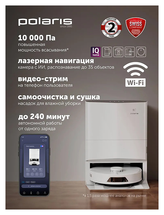 Робот пылесос со станцией самоочистки Polaris PVCRAC 7750 WIFI IQ Home созданный для сухой, влажной и комбинированной уборки, обеспечивает идеальную чистоту в вашем доме. Устройство оснащено системой построения до 5 карт помещения и возможностью управления через смартфон, а также голосовыми помощниками. В комплект входит: