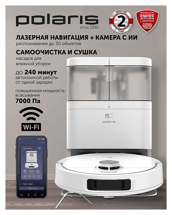 Робот пылесос со станцией самоочистки Polaris PVCRAC 7290 WIFI IQ Home созданный для сухой, влажной и комбинированной уборки, обеспечивает идеальную чистоту в вашем доме. Устройство оснащено системой построения до 5 карт помещения и возможностью управления через смартфон, а также голосовыми помощниками. В комплект входит пылесос, фильтр НЕРА 1 шт, микрофибра 2 шт, 1 боковая щетка, щеточка для очистки, мешок для пыли 1 шт, зарядная база, адаптер, инструкция. Особенности: