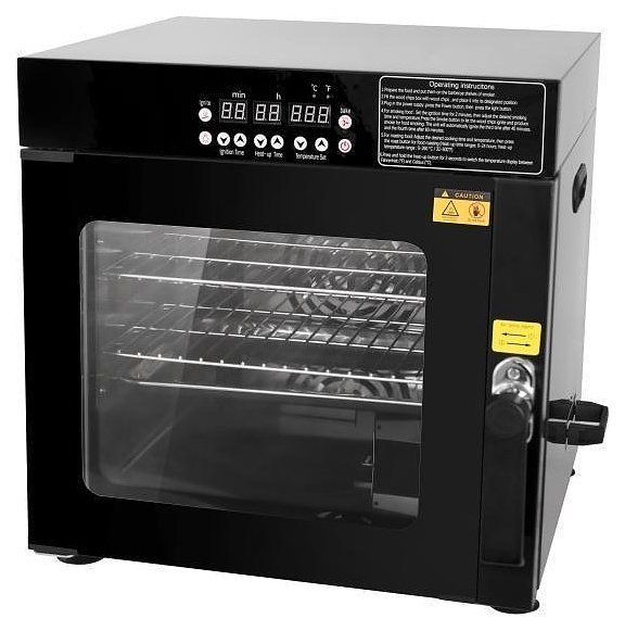 Электрическая печь-коптильня Airhot ESM-102 используется на предприятиях общественного питания и торговли, а также в домашних условиях для холодного и горячего копчения мяса, рыбы, птицы, колбас, сыров и других продуктов. Модель оснащена рабочей камерой с левосторонней распашной дверью и расположенной в верхней части фронта электронной панелью управления с функциональными клавишами и 3 цифровыми дисплеями индикации. Корпус выполнен из нержавеющей стали марки AISI 201, полки – из металла с хромированной поверхностью. Комплектация: