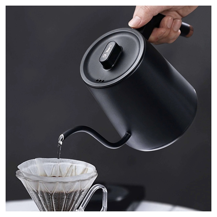 Электрический чайник ZeroHero WUMING E-Kettle Pro предназначен для заваривания кофе методом пуровер в кофейнях, отелях, офисах и домашних условиях. Модель оснащена тонким изящным носиком, удобной рукояткой, крышкой с 3 паровыми отверстиями, прямоугольной подставкой с функциональной нажимной клавишей на торце, сенсорной панелью управления и 2 цифровыми дисплеями с белой подсветкой индикации. Корпус выполнен из безопасной для пищевой промышленности нержавеющей стали марки SUS304 матовым тефлоновым покрытием черного цвета, рукоятка – из термостойкого пластика с золотистым наконечником. Особенности:
