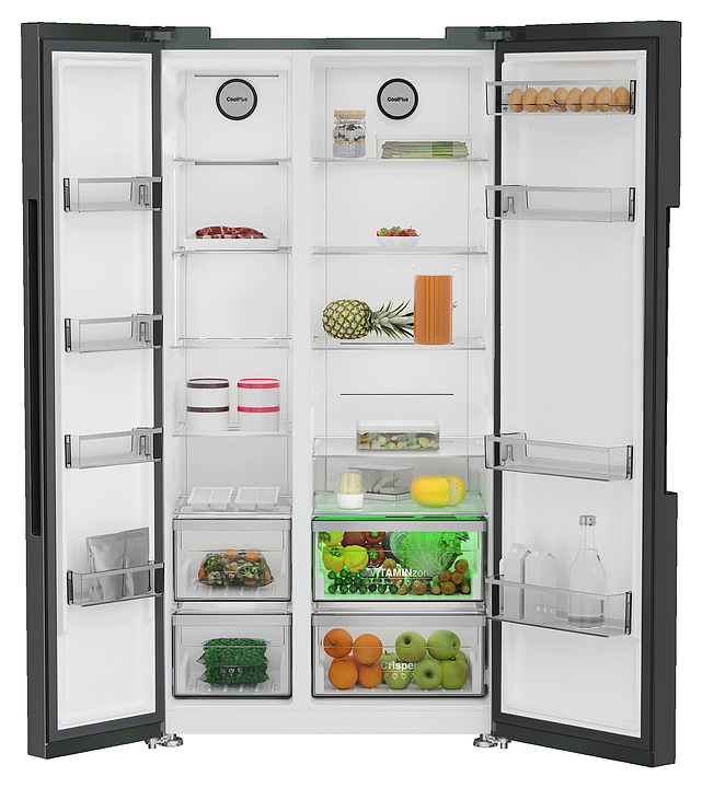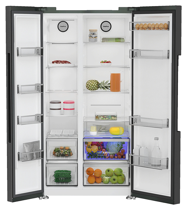 Холодильник Grundig GSN30110FXBR предназначен для охлаждения, замораживания, кратковременного и длительного хранения продуктов питания в частных домах, квартирах, отелях и офисах. Модель оснащена 2 дверьми, боковой морозильной камерой, электронным дисплеем на двери и ярким LED освещением в обеих камерах. Инверторный компрессор гарантирует низкий уровень шума и стабильную работу. Система охлаждения Duo-Cooling No Frost предотвращает образование наледи на стенках морозильной камеры и освобождает пользователя от необходимости размораживания холодильника. Зона свежести FullFresh+ позволяет поддерживать стабильный уровень влажности внутри ящика для овощей и фруктов, благодаря чему продукты внутри остаются свежими до 30 суток. Инновационная технология 3 цветов VitaminZone имитирует природный цикл солнечного света для сохранения полезных веществ в овощах и фруктах. Ручка выполнена из пластика, полки - из закаленного стекла, отделка полок - из металла. В комплект поставки входят лоток для замораживания мелких продуктов ICE BANK (пельменница), 2 формы для кубиков льда и подставка для яиц 1х10. Особенности: