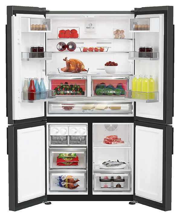 Холодильник Grundig GQN20130LXBR предназначен для охлаждения, замораживания, кратковременного и длительного хранения продуктов питания в частных домах, квартирах, отелях и офисах. Модель оснащена 4 дверьми, нижней морозильной камерой и электронным дисплеем на двери. Инверторный компрессор гарантирует низкий уровень шума и стабильную работу. Система охлаждения Trio-Cooling No Frost предотвращает образование наледи на стенках морозильной камеры и освобождает пользователя от необходимости размораживания холодильника. Зона свежести FullFresh+ позволяет поддерживать стабильный уровень влажности внутри ящика для овощей и фруктов, благодаря чему продукты внутри остаются свежими до 30 суток. Инновационная технология 3 цветов VitaminZone имитирует природный цикл солнечного света для сохранения полезных веществ в овощах и фруктах. Ручка выполнена из металла, полки - из стекла. В комплект поставки входят лоток для замораживания мелких продуктов ICE BANK (пельменница) и подставки для яиц 2х10. Особенности: