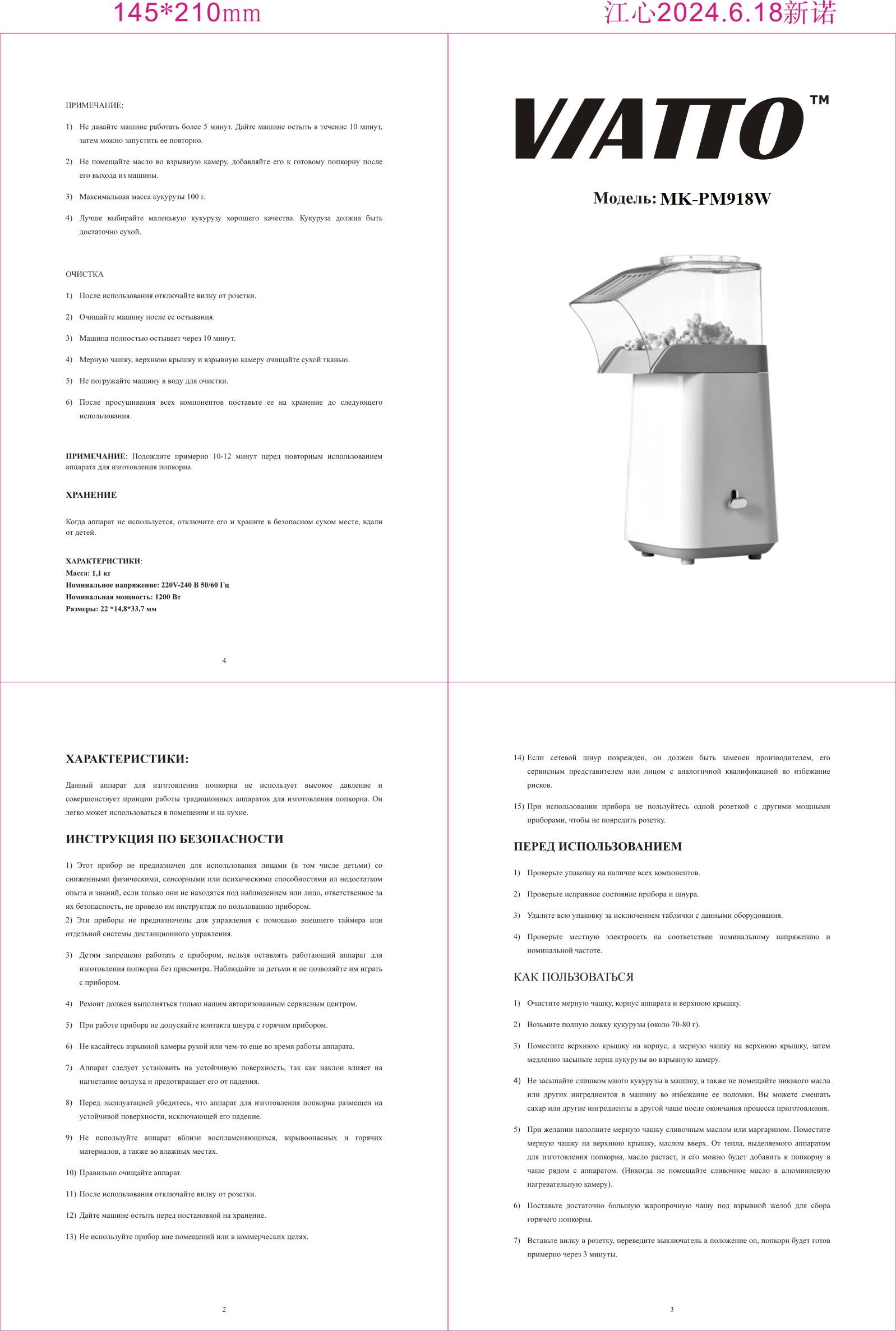 Аппарат для попкорна VIATTO MK-PM918W используется в домашних условиях для приготовления воздушной кукурузы с различными вкусовыми добавками. Корпус выполнен из пластика, чаша - из алюминия с антипригарным покрытием, крышка - из прозрачного поликарбоната. Дополнительные характеристики: