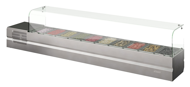 Холодильная витрина ATESY Болоньезе-10 используется на предприятиях общественного питания и торговли для кратковременного хранения и демонстрации компонентов пиццы (топпингов). Модель оснащена встроенным холодильным агрегатом, верхняя крышка которого выполнена в виде горизонтальной площадки для размещения вспомогательных предметов. Корпус выполнен из нержавеющей стали AISI430 и моллированного стекла, все конструктивные элементы, контактирующие с продуктами питания - из нержавеющей стали, разрешенной Госсанэпиднадзором для контакта с пищей.