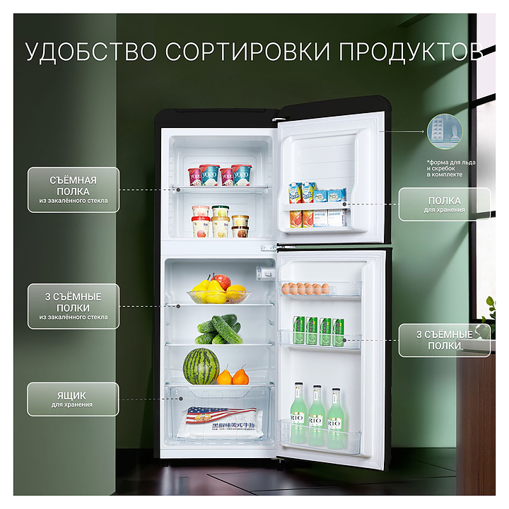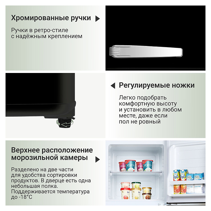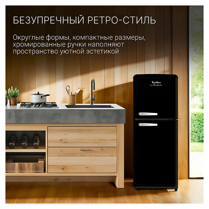Двухкамерный холодильник TESLER Margherita RT-110 BLACK предназначен для хранения, охлаждения и заморозки продуктов питания и напитков, а так же готовой пищи в частных домах, квартирах, отелях и офисах. Модель оснащена механическим термостатом, расположенным в холодильном отделении, а также стандартным компрессором классом энергопотребления А. Корпус выполнен из высококачественной стали, съемные полки из прочного стекла, ручки дверцы из пластика. Холодильное отделение:
