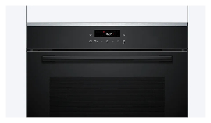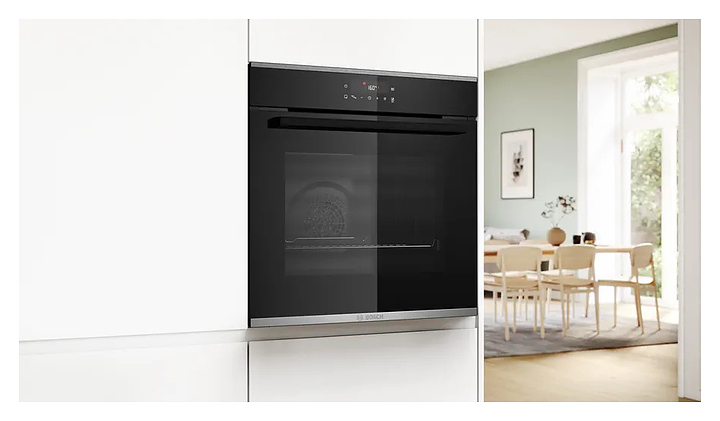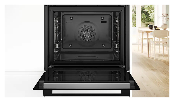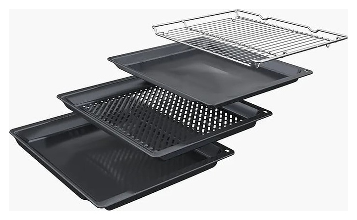 Встраиваемый электрический духовой шкаф Bosch HBG272EB3 серии 4 предназначен для приготовления большого ассортимента блюд в домашних условиях. Модель оснащена жарочной камерой с расположенными в задней стенке кольцевым нагревательным элементом и вентилятором, верхним и нижним нагревательными элементами, верхним грилем, 2 боковыми стойками с 5 уровнями направляющих для противней, откидной дверью со смотровым окном и длинной уплощенной горизонтальной рукояткой, расположенной в верхней части фронта электронной панелью управления с сенсорными функциональными клавишами и жидкокристаллическим дисплеем с белой подсветкой индикации. Корпус выполнен из стали, фронтальные панели черного цвета с полным остеклением без винтового крепежа с металлическими рамками цвета нержавеющей стали по горизонтальным кромкам, рукоятка – из металла с матовой черной поверхностью, противни – из стали с эмалированным покрытием, боковые стойки, направляющие и решетка – из металла с хромированной поверхностью.