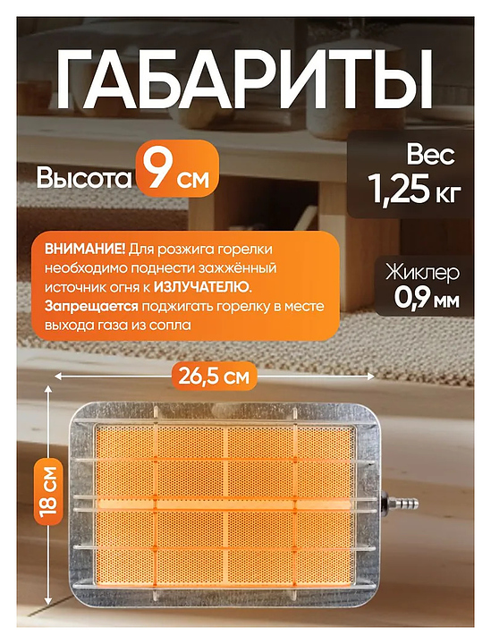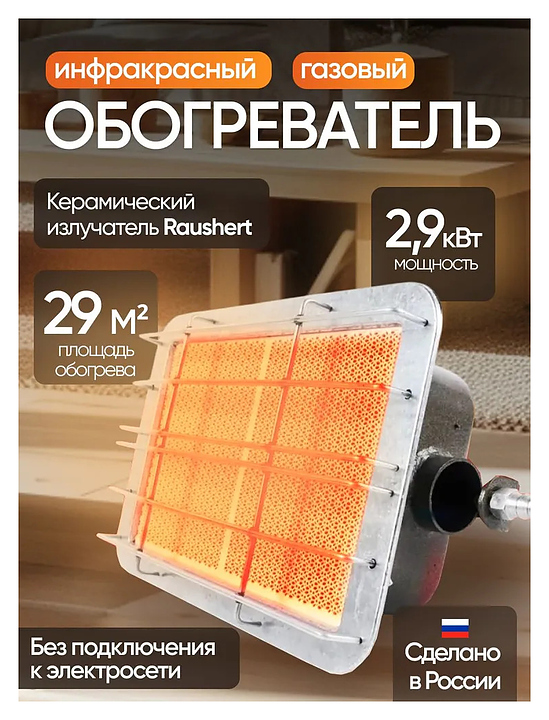 Горелка инфракрасного излучения Солярогаз ГИИ-2.9 Н САВО использует инфракрасные технологии, что обеспечивает быстрый и эффективный обогрев. Устройство идеально подходит для использования в закрытых помещениях, таких как дачи, гараж или бытовые мастерские, а также на открытых площадках во время пикников или на улице. Обогреватель инфракрасный оснащен системой безопасности, что делает его максимально безопасным в эксплуатации. Корпус выполнен из металла. Внимание: Для розжига горелки необходимо поднести источник огня к излучателю. Запрещается поджигать горелку в месте выхода газа из сопла. Использование данного обогревателя допускается только в помещениях с естественной вентиляцией или на улице.Чтобы присоединить обогреватель к газовому баллону требуется установить редуктор бытового типа (приобретается отдельно). Комплектация: