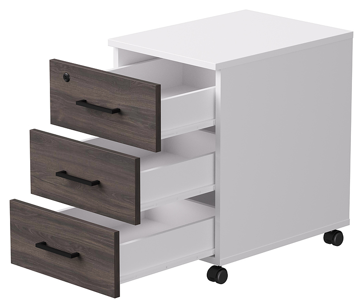 Мобильная тумба Everprof EVO используется в офисных помещениях для хранения документов. Модель оснащена 3 выдвижными ящиками, удобными ручками и 4 колесами. Встроенный замок на верхнем ящике позволяет хранить ценные вещи в безопасности. Столешница, каркас, фасады и задняя стенка выполнены из ЛДСП. Дополнительные характеристики: