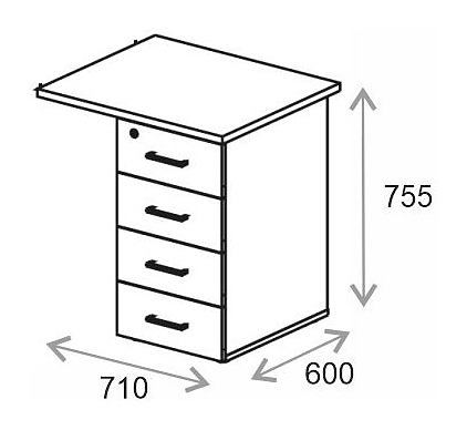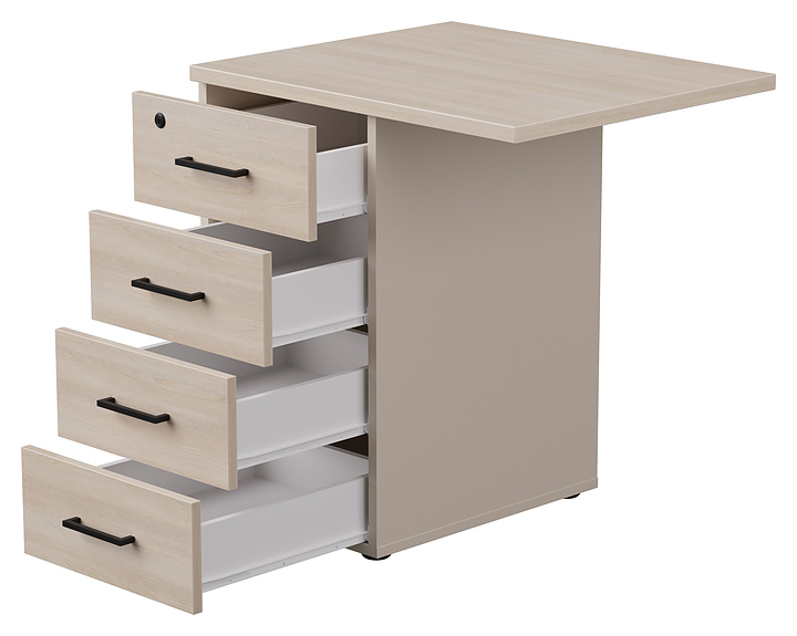 Приставная тумба Everprof EVO используется в офисных помещениях в составе линейки мебели для персонала EVO или отдельно. Модель оснащена 4 выдвижными ящиками и удобными ручками. Встроенный замок на верхнем ящике позволяет хранить ценные вещи в безопасности. Столешница, каркас, фасады и задняя стенка выполнены из ЛДСП. В комплект поставки входит топ. Дополнительные характеристики: