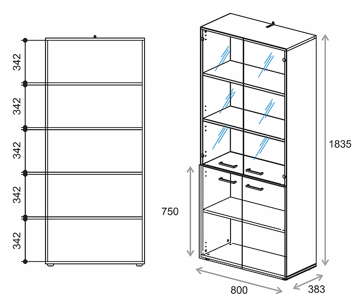 Шкаф для документов Everprof EVO используется в офисных помещениях в составе линейки мебели для персонала EVO или отдельно. Модель оснащена 2 глухими и 2 прозрачными распашными дверьми. Каркас, нижние фасады и полки выполнены из ЛДСП, прозрачные фасады - из стекла, задняя стенка - из HDF. Дополнительные характеристики:
