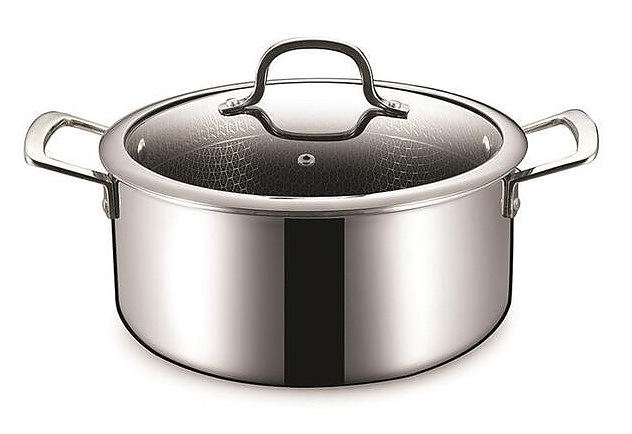 Кастрюля P.L. Proff Cuisine New Kitchen Grid 81280233 предназначена для профессионального использования на предприятиях общественного питания и торговли, в ресторанах, кафе, барах, а также домашних условиях для приготовления широкого спектра блюд, Используется на любых типах печей, в том числе индукционных. Модель оснащена двумя удобными ручками и прозрачной стеклянной крышкой с ободом из нержавеющей стали. Изделие выполнено по технологии TRI-PLY (с уникальной архитектурой рабочей поверхности, нанесенной лазером в виде рельефного сетчатого узора, последующим травлением и нанесением антипригарного покрытия) из алюминия и высококачественной нержавеющей стали, которая отличается прочностью, долговечностью и безопасностью, не изменяет вкусовые качества, запах и цвет пищи, так как не вступает в реакцию с её компонентами. Внимание! При использовании кастрюли необходимо свести к минимуму сильное нагревание, так как материал кастрюли обладает очень сильной теплопроводностью и как следствие быстрым нагревом. Это снизит прилипание продуктов и предотвратит подгорание. Особенности: