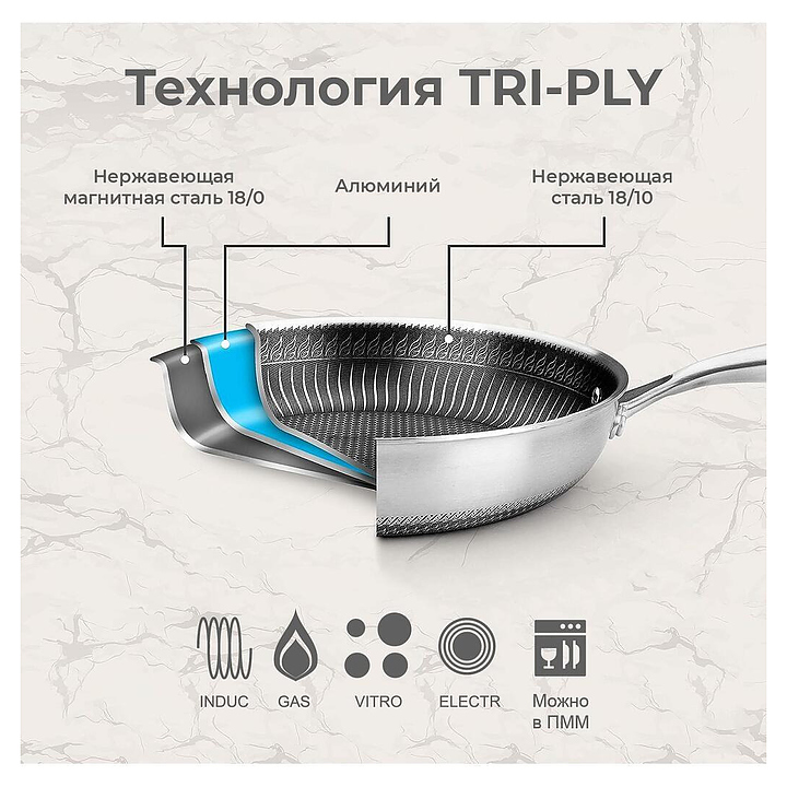 Сковорода P.L. Proff Cuisine New Kitchen Grid 81280251 предназначена для профессионального использования на предприятиях общественного питания и торговли, в ресторанах, кафе, барах, а также домашних условиях для приготовления широкого спектра блюд, Используется на любых типах печей, в том числе индукционных. Модель оснащена удобной ручкой с отверстием для подвешивания. Изделие выполнено по технологии TRI-PLY (с уникальной архитектурой рабочей поверхности, нанесенной лазером в виде рельефного сетчатого узора, последующим травлением и нанесением антипригарного покрытия) из алюминия и высококачественной нержавеющей стали, которая отличается прочностью, долговечностью и безопасностью, не изменяет вкусовые качества, запах и цвет пищи, так как не вступает в реакцию с её компонентами. Внимание! Важно! Перед первым использованием сковороду нужно вымыть с моющим средством, затем налить 2/3 воды от объема и довести до кипения на среднем огне, подождать 5 минут, выключить нагрев и оставить остывать естественным образом еще на 5 минут. Затем смажьте внутреннюю поверхность сковороды растительным маслом (или любым жиром) и нагревайте ее на среднем огне, 1-2 минуты. После дайте остыть и очистите ее водой. При дальнейшем использовании, необходимо свести к минимуму сильное нагревание, так как сковорода обладает очень сильной теплопроводностью. Это снизит прилипание продуктов к сковороде и предотвратит подгорание. Особенности: