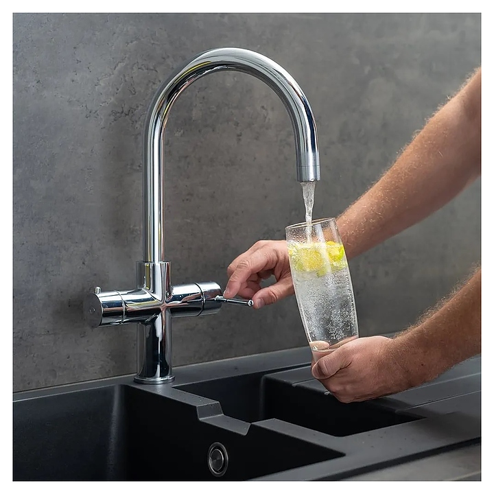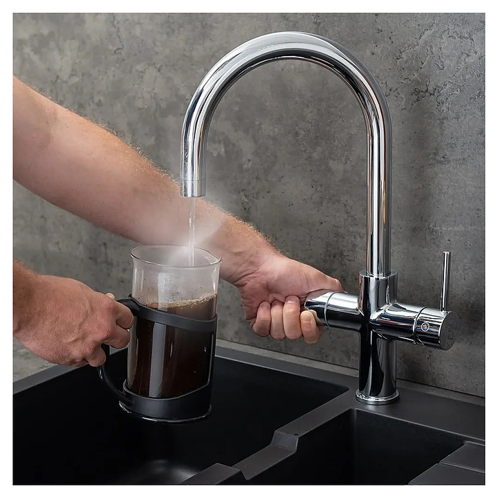 Система мгновенного кипячения воды ArtisanTech 5 в 1 Aquahot Montblanc - инновационный кухонный смеситель с бойлером используется для получения кипятка, горячей, холодной и фильтрованной воды в загородных домах и квартирах. Система нагрева и фильтрации, располагается под раковиной и включает в себя: изолированный резервуар, обеспечивающий мгновенный доступ к кипящей воде, прямое подключение к водопроводу для холодной, горячей и фильтрованной воды, интегрированные фильтры, очищающие воду от примесей, систему газации и охлаждения и простую систему переключения между режимами. Модель оснашена интуитивно понятным управлением. Смеситель изготовлен из высококачественной латуни. Внимание! Баллон с газом в комплект поставки не входит и приобретается отдельно. Комплект поставки: