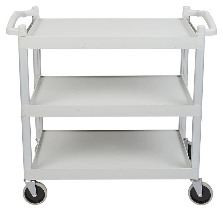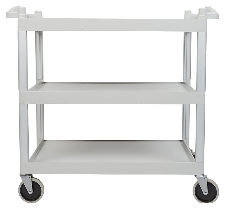 Тележка для обслуживания Cambro BC340KD 480 предназначена для транспортировки посуды, инвентаря, продуктов, пищевых отходов и предметов сервировки на предприятиях общественного питания, в медицинских учреждениях, санаториях и отелях. Изделие значительно облегчает и ускоряет процесс перемещения. Корпус выполнен из алюминия, полки - из полипропилена. Особенности: