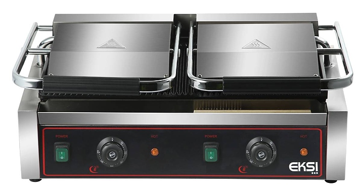 Прижимной гриль EKSI HEG-813 предназначен для жарки, быстрого приготовления и разогрева блюд из мяса, рыбы, птицы и полуфабрикатов на предприятиях общественного питания и торговли. Одновременное воздействие на продукты сразу 2 рабочих поверхностей обеспечивает равномерную прожарку. Модель оснащена 2 терморегуляторами с независимой установкой температуры для каждой зоны. Корпус выполнен из нержавеющей стали, рабочая поверхность - из чугуна с эмалевым покрытием. Дополнительные характеристики: