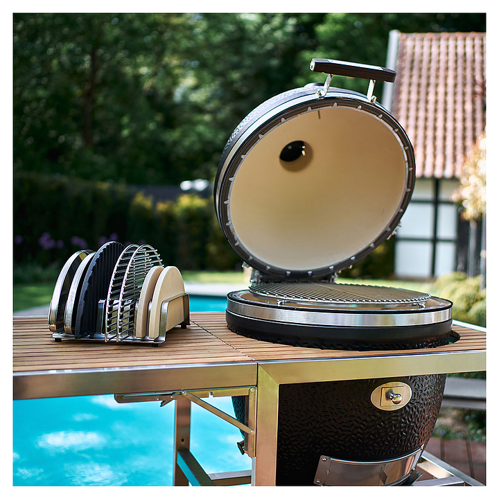 Керамический гриль Monolith Grill AVAHTGARDE.66 Lechef 301030-SET2 предназначен для приготовления блюд на древесном угле в частных домах и на предприятиях общественного питания. Модель сочетает в себе 5 видов оборудования для высокотемпературного приготовления пищи: мангал, тандыр, барбекю, гриль и коптильня. Гриль изготовлен из силикатной керамики в сочетании с минеральной глазурью, что обеспечивает непревзойденную теплоизоляцию и устойчивость к ультрафиолетовому излучению, обруч крепления крышки и корпуса изготовлен из 4х миллиметровой стали с сатиново-матовой минеральной глазурью, прочной и абсолютно устойчивой к атмосферным воздействиям. Комплектация: