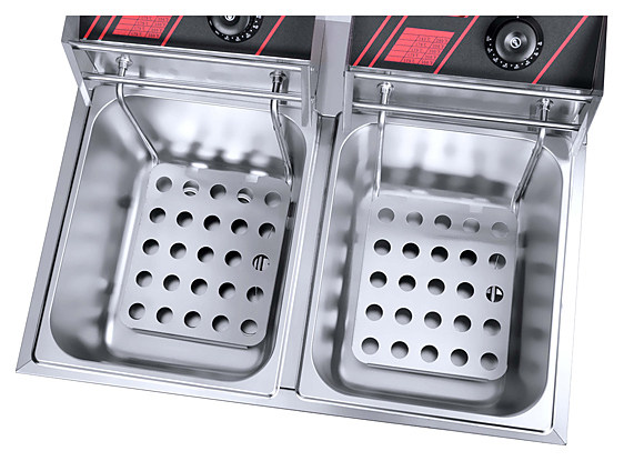 Фритюрница Hurakan HKN-FR66L предназначена для приготовления широкого спектра блюд в большом объеме разогретого до определенной температуры масла или жира на предприятиях общественного питания и торговли. Модель оснащена электромеханической системой управления, регулировкой температуры и холодной зоной. Корпус выполнен из нержавеющей стали. В комплект поставки входят 2 корзины с крышками и 2 вилки. Особенности: