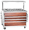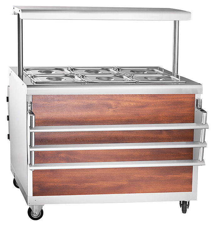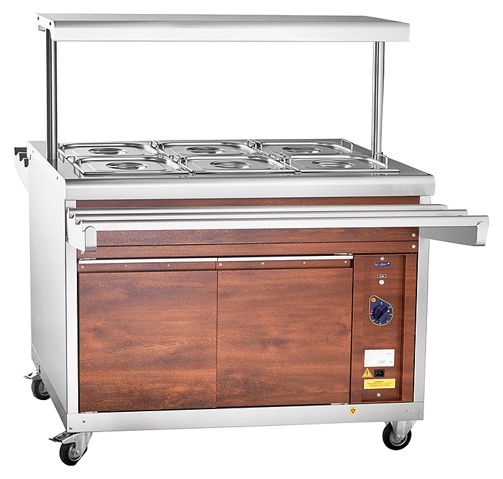 Мармит Abat ЭМК-70ПМ используется в составе линии раздачи Передвижная для демонстрации, кратковременного хранения и поддержания вторых блюд в горячем состоянии в составе линий раздач на предприятиях общественного питания и торговли. Модель оснащена регулируемыми по высоте ножками. Конструкция выполнена из металла, кашированного под дерево. Особенности: