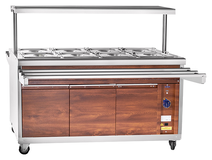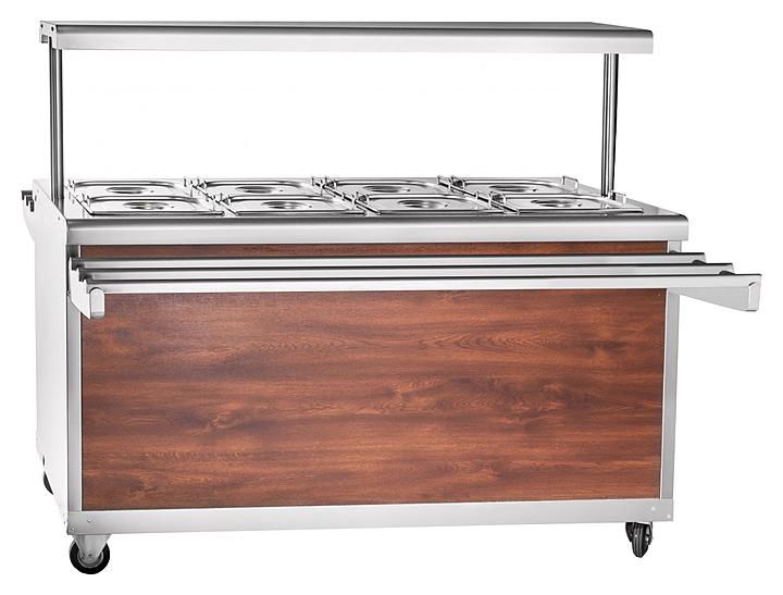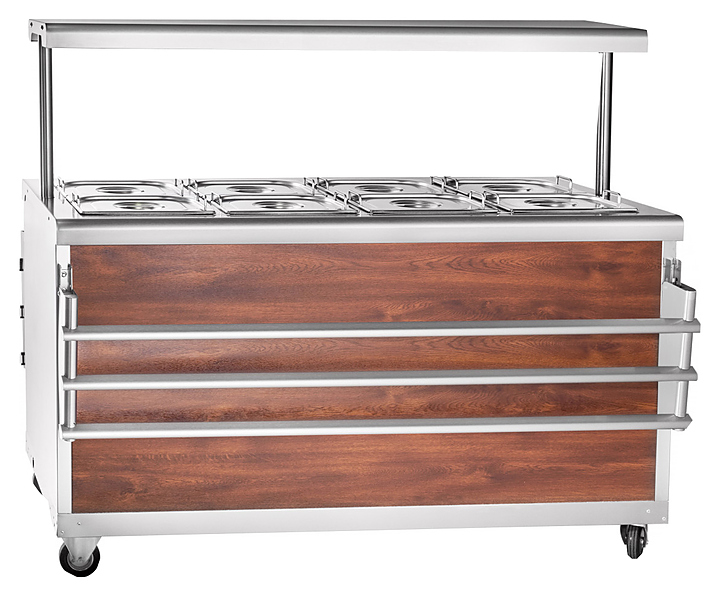Мармит Abat ЭМК-70ПМ-01 используется в составе передвижной линии раздач для демонстрации, кратковременного хранения и поддержания вторых блюд в горячем состоянии в составе линий раздач на предприятиях общественного питания и торговли. Модель оснащена регулируемыми по высоте ножками. Конструкция выполнена из металла, кашированного под дерево. Особенности: