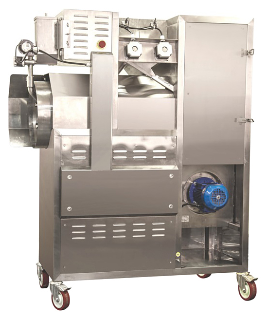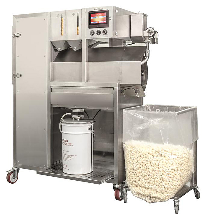 Аппарат для попкорна RoboLabs Robopop 60 предназначен для раскрытия кукурузного зерна при помощи горячего воздуха на предприятиях пищевой промышленности. Распределение зерна по параболическому дну чаши рабочей камеры происходит равномерным слоем. Зерно постоянно находится в движении вокруг оси чаши, перемешивается и равномерно прогревается. Благодаря вихревому воздушному потоку внутри камеры, раскрывшиеся зерна немедленно удаляются из горячей зоны, что благотворно сказывается на качестве и вкусе попкорна. Модель оснащена двойным дозатором и сифтером, куда попадает раскрытое кукурузное зерно, и происходит отделение шелухи и нераскрытых зерен от готового попкорна. В последующем такой попкорн идеально подходит для нанесения карамельной смеси или изготовления попкорна с заданным вкусом. Оборудование выполнено из нержавеющей стали. В комплекте поставки входят 2 тележки для готового попкорна. Особенности:
