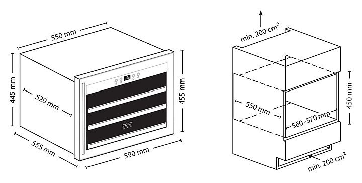 Встраиваемый винный шкаф CASO WineSafe 18 EB предназначен для охлаждения и длительного хранения бутилированного и разливного вина в частных домах, квартирах, отелях и офисах. Модель оснащена панелью управления c белым LED-дисплеем, показывающим текущую температуру, и 3 деревянными выдвижными полками. Ручка выполнены из нержавеющей стали, дверца - из 3-слойного стекла с ультрафиолетовым фильтром. Особенности: