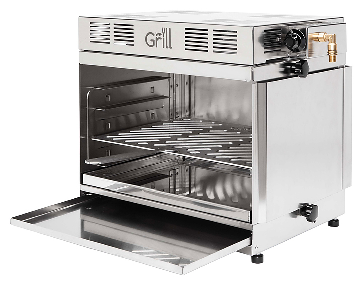Газовый гриль WeGrill In&Out предназначен для приготовления различных блюд путем обжигания (грилливания), запекания, карамелизации, гратинирования, а также с использованием технологии Sous Vide на предприятиях общественного питания и торговли. Поверхность мяса и рыбы, обработанной таким образом, мгновенно «запечатывается»: на ней появляется нежная корочка, а весь сок и аромат остаются внутри. Модель оснащена 3 инфракрасными газовыми горелками и 2 поддонами для жира. Корпус изготовлен из нержавеющей стали AISI 304. В комплект поставки входят газовый редуктор повышенной безопасности с 2 мембранами, в котором дополнительная мембрана подстраховывает основную в случае ее поломки, газовый шланг и сумка для транспортировки и хранения. Особенности:
