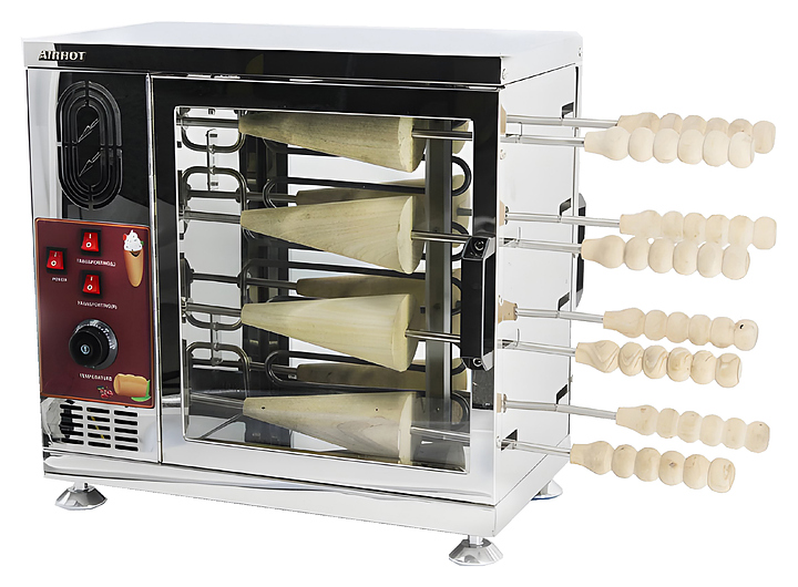 Аппарат для трдельников Airhot TM-8 используется на предприятиях общественного питания и торговли для выпечки чешских трубочек (трдельников). Модель оснащена терморегулятором и подсветкой. Корпус выполнен из нержавеющей стали. В комплект поставки входят 16 шампуров: конусных и цилиндрических. Для подключения к электричеству необходим штекер от 25 до 32А, который в комплект поставки не входит и приобретается отдельно. Дополнительные характеристики: