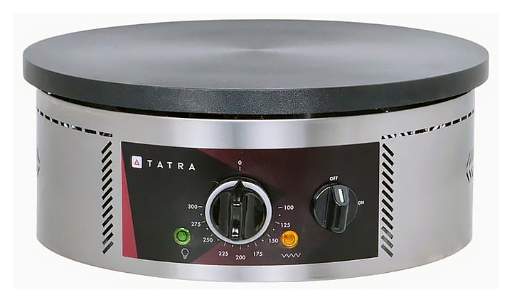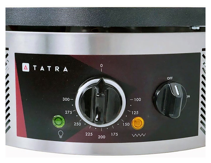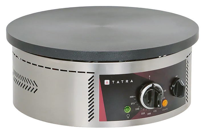 Блинница Tatra TCM R 40 предназначена для выпечки блинов на предприятиях общественного питания и торговли. Модель оснащена электромеханической панелью управления с терморегулятором и индикаторами питания и нагрева. Корпус выполнен из нержавеющей стали, жарочные поверхности имеют тефлоновое покрытие, обеспечивающие высокие антипригарные свойства. Дополнительные характеристики: