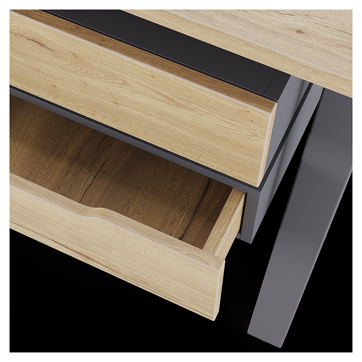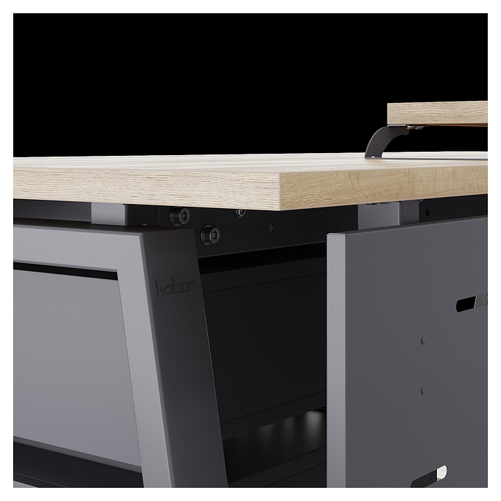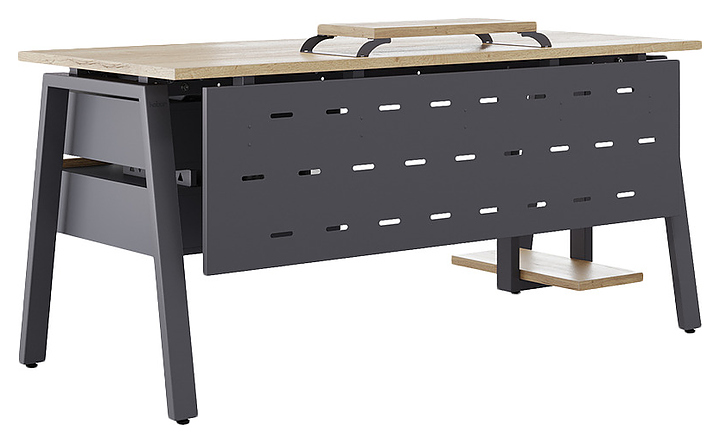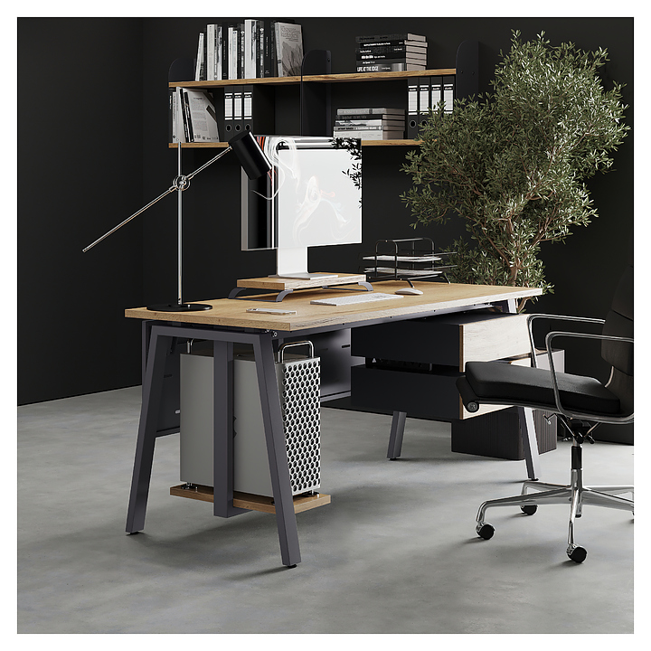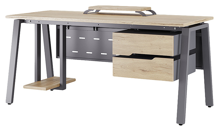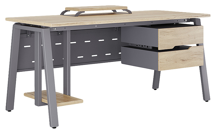 Компьютерный стол Кобор KA-160/70 graphite/natural используется в офисных помещениях и кабинетах руководителей. Модель оснащена A-образными опорами. Каркас выполнен из металла, выкрашенного в цвет графит муар (RAL7024), столешница – из ламинированной древесно-стружечной плиты (ЛДСП) цвета натуральный дуб (H1180 ST37). Опции (заказываются отдельно):