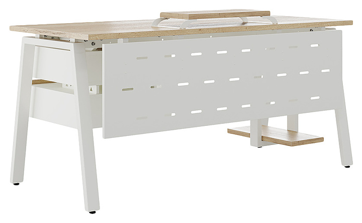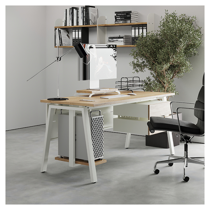 Компьютерный стол Кобор KA-160/70 white/natural используется в офисных помещениях и кабинетах руководителей. Модель оснащена A-образными опорами. Каркас выполнен из металла, выкрашенного в цвет белый муар (RAL9016), столешница – из ламинированной древесно-стружечной плиты (ЛДСП) цвета натуральный дуб (H1180 ST37). Опции (заказываются отдельно):