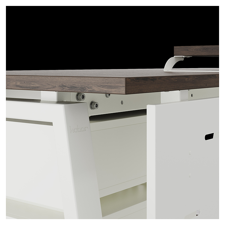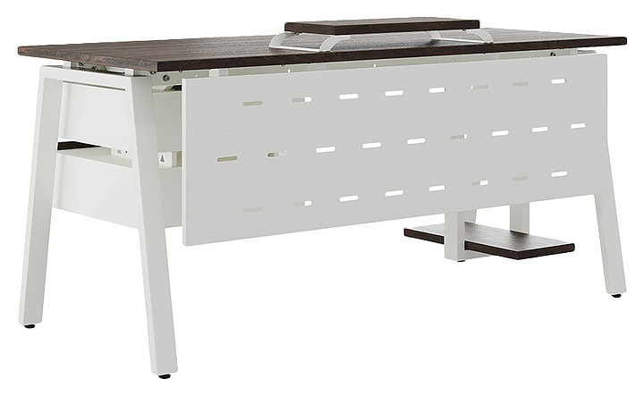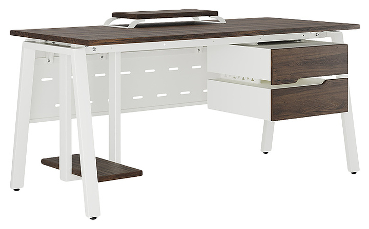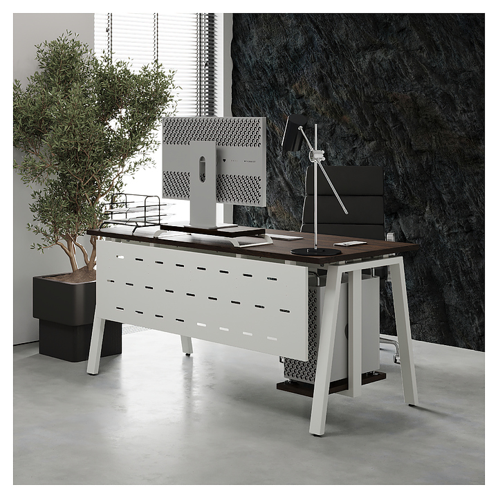 Компьютерный стол Кобор KA-160/70 white/charlston используется в офисных помещениях и кабинетах руководителей. Модель оснащена A-образными опорами. Каркас выполнен из металла, выкрашенного в цвет белый муар (RAL9016), столешница – из ламинированной древесно-стружечной плиты (ЛДСП) цвета дуб чарльстон (H3154 ST36).