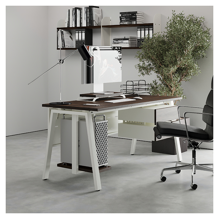Компьютерный стол Кобор KA-180/70 white/charlston используется в офисных помещениях и кабинетах руководителей. Модель оснащена A-образными опорами. Каркас выполнен из металла, выкрашенного в цвет белый муар (RAL9016), столешница – из ламинированной древесно-стружечной плиты (ЛДСП) цвета дуб чарльстон (H3154 ST36). Опции (заказываются отдельно):