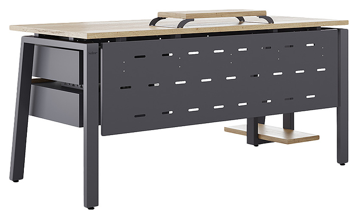 Компьютерный стол Кобор КAB-120/70 graphite/natural используется в офисных помещениях и кабинетах руководителей. Модель оснащена A-образными опорами со скошенными фронтальными сегментами. Каркас выполнен из металла, выкрашенного в цвет графит муар (RAL7024), столешница – из ламинированной древесно-стружечной плиты (ЛДСП) цвета натуральный дуб (H1180 ST37). Опции (заказываются отдельно):