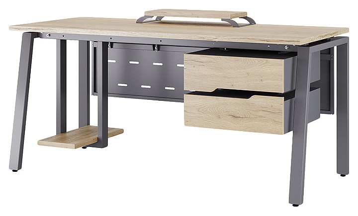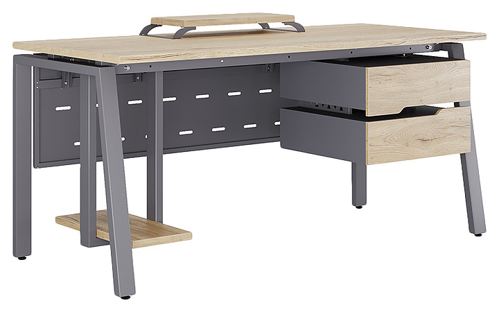 Компьютерный стол Кобор КAB-160/70 graphite/natural используется в офисных помещениях и кабинетах руководителей. Модель оснащена A-образными опорами со скошенными фронтальными сегментами. Каркас выполнен из металла, выкрашенного в цвет графит муар (RAL7024), столешница – из ламинированной древесно-стружечной плиты (ЛДСП) цвета натуральный дуб (H1180 ST37). Опции (заказываются отдельно):