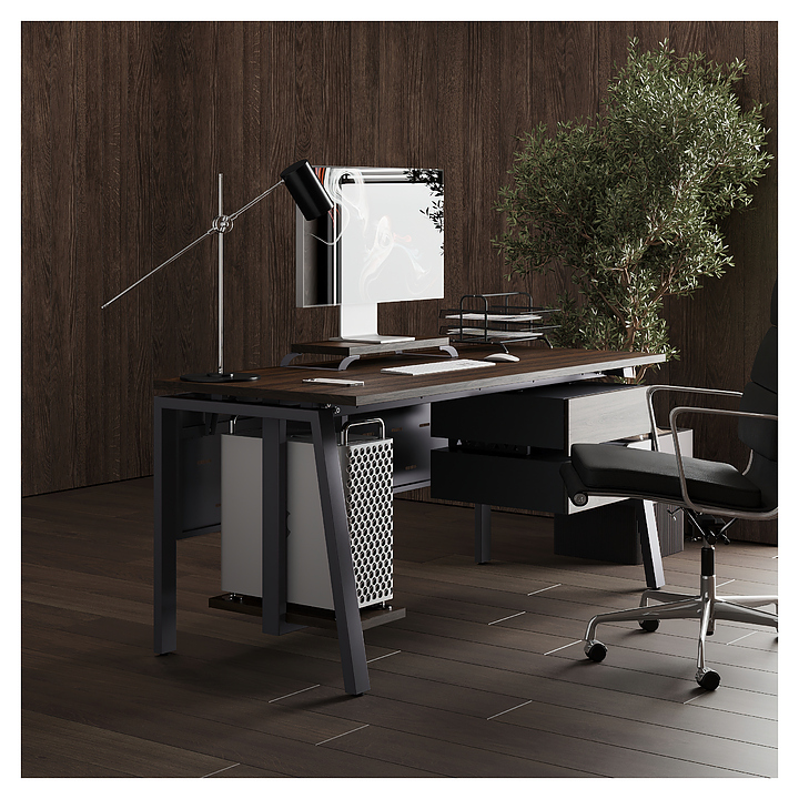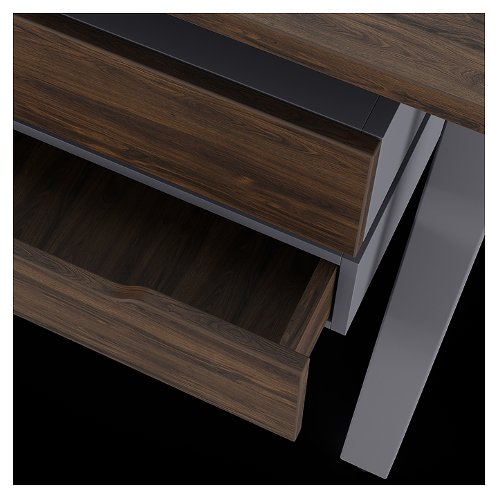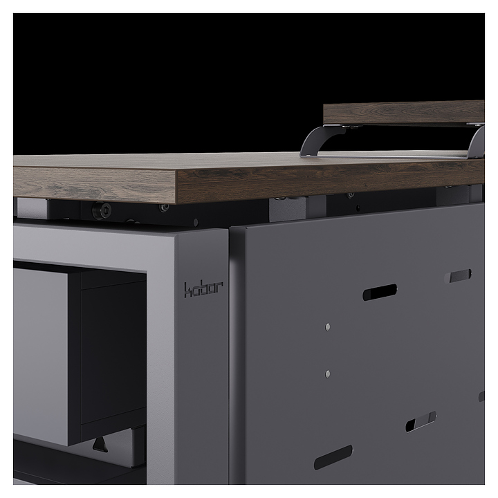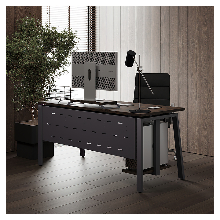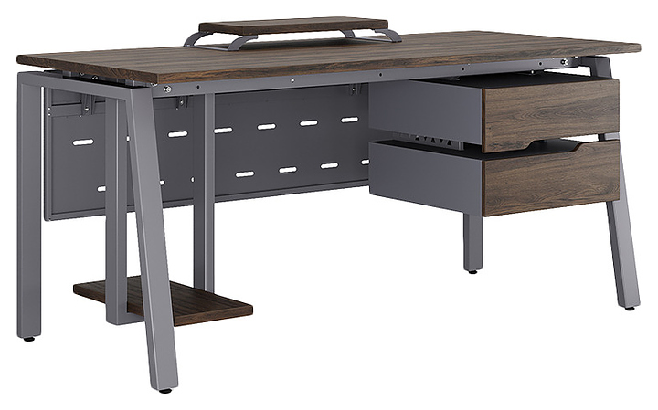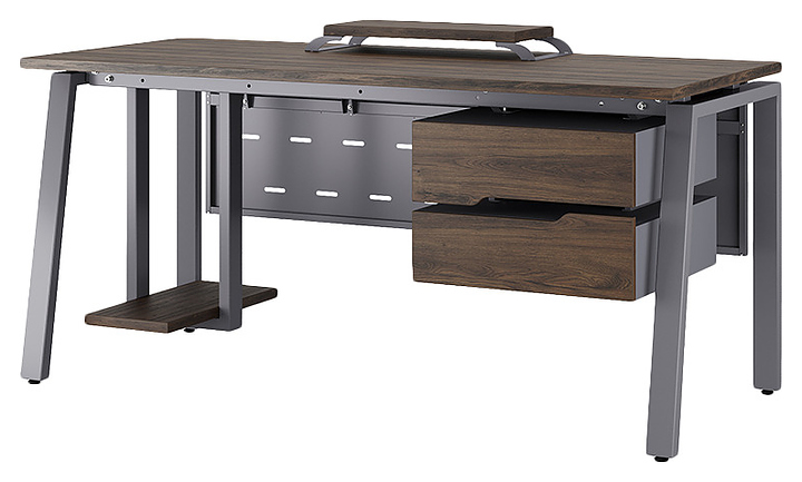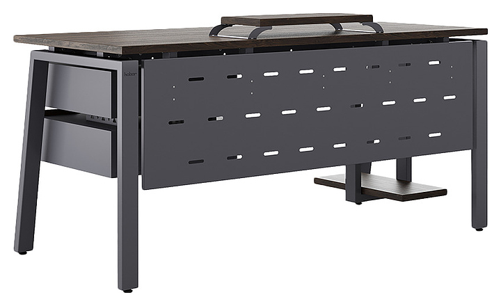 Компьютерный стол Кобор КAB-180/70 graphite/charlston используется в офисных помещениях и кабинетах руководителей. Модель оснащена A-образными опорами со скошенными фронтальными сегментами. Каркас выполнен из металла, выкрашенного в цвет графит муар (RAL7024), столешница – из ламинированной древесно-стружечной плиты (ЛДСП) цвета дуб чарльстон (H3154 ST36). Опции (заказываются отдельно):