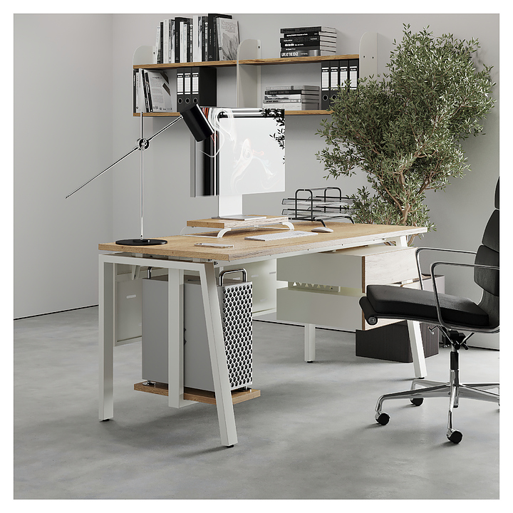 Компьютерный стол Кобор КAB-120/70 white/natural используется в офисных помещениях и кабинетах руководителей. Модель оснащена A-образными опорами со скошенными фронтальными сегментами. Каркас выполнен из металла, выкрашенного в цвет белый муар (RAL9016), столешница – из ламинированной древесно-стружечной плиты (ЛДСП) цвета натуральный дуб (H1180 ST37). Опции (заказываются отдельно):