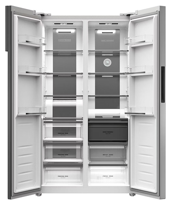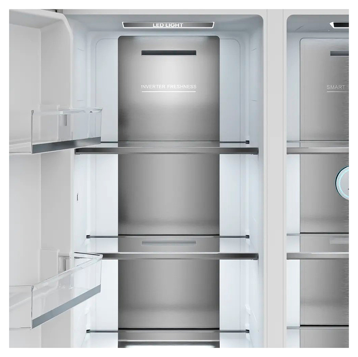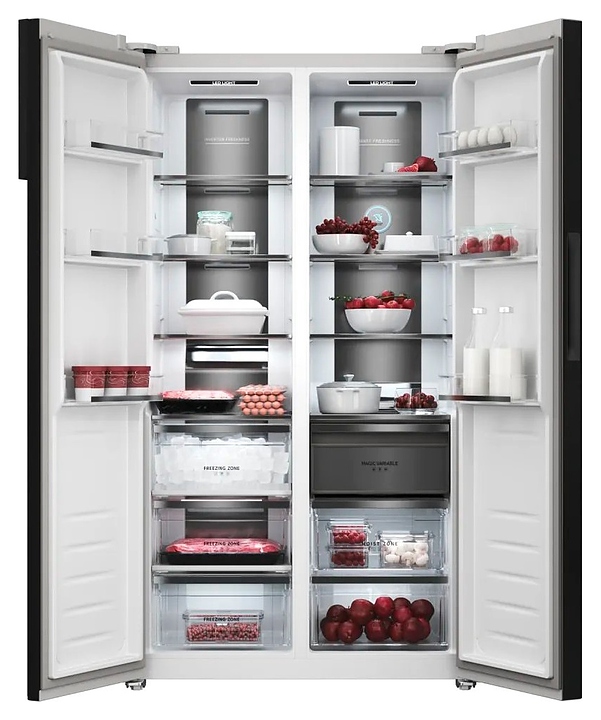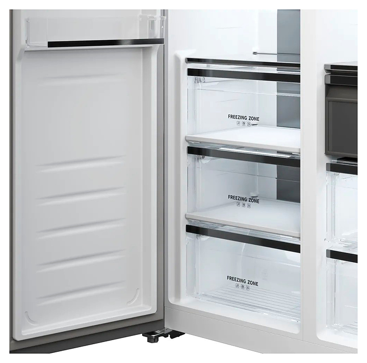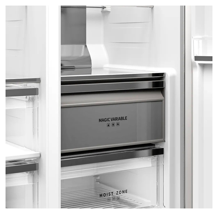 Холодильник Kuppersberg RFSN 1810 X типа Side- by-Side предназначен для охлаждения, замораживания, кратковременного и длительного хранения пищевых продуктов и напитков в гостиничных комплексах, офисах, а также домашних условиях. Модель оснащена холодильной камерой справа и морозильной камерой слева с распашными дверьми, кабелем питания с евровилкой, расположенной в верхней части фасада электронной панелью управления с сенсорными функциональными клавишами, дисплеем с цифровыми и символьными сегментами индикации с белой подсветкой. Фасады дверей и боковины выполнены из металла с поверхностью оттенка нержавеющая сталь, внутренняя облицовка камер – из антибактериального пластика белого цвета, задние стенки камер с металлическими панелями, плоские полки – из прозрачного закаленного стекла, ящики – из белого пластика с прозрачным фронтом, навесные полки – из прозрачного пластика, ящики и полки декорированы фронтальными металлическими окантовками серебристого оттенка, упаковка – из гофрокартона, полимерной пленки и полистирола.