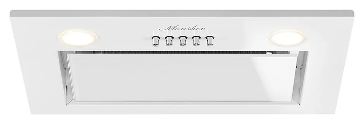 Встраиваемая кухонная вытяжка Monsher INNA 40 Blanc предназначена для очистки воздуха от продуктов горения, копоти и запахов в процессе приготовления пищи путем принудительной вентиляции в домашних условиях. Модель оснащена вентилятором с электродвигателем, кабелем питания, 2 круглыми светильниками и панелью управления с нажимными функциональными клавишами. Короб выполнен из стали с поверхностью цвета нержавеющая сталь, фасадная панель прямоугольной формы с покрытием термостойкой эмалью белого цвета, откидная крышка – с поверхностью из закаленного стекла белого цвета, жироулавливающий фильтр – из алюминия, фурнитура с серебристой поверхностью. Комплектация: