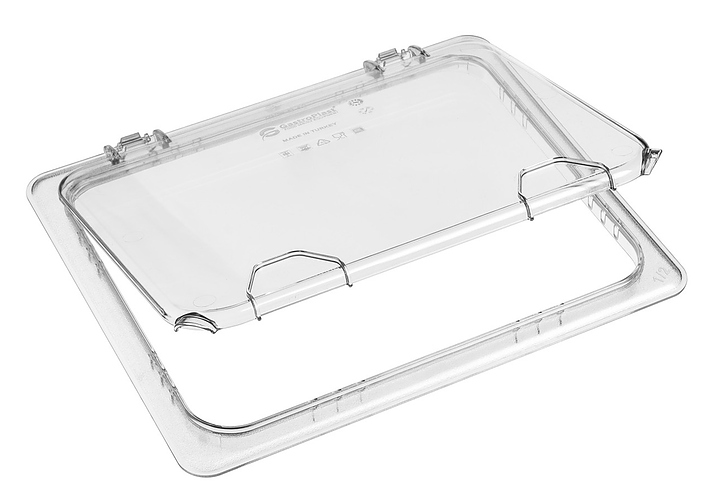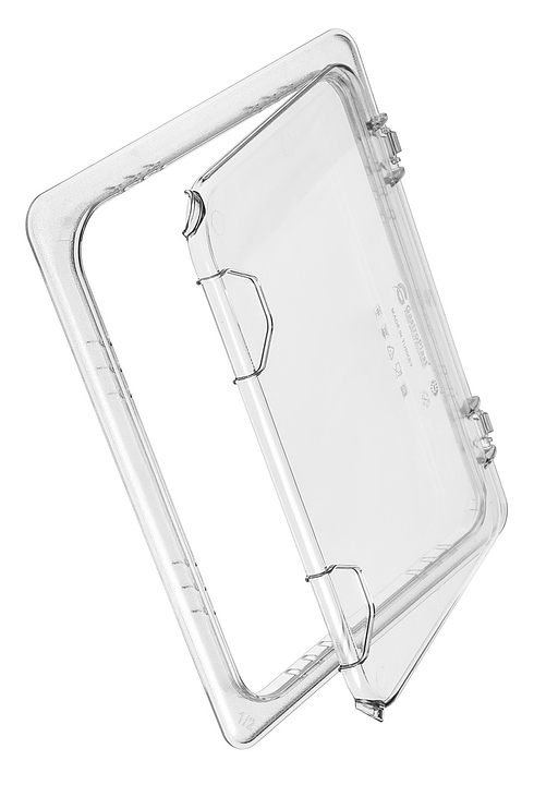 Крышка для гастроемкости Gastroplast 79215 GN 1/2 откидная, с отверстием для ложки для профессионального использования совместно с гастроемкостью GN 1/2 (79755,79757,79758,79760) на предприятиях общественного питания и торговли, в ресторанах, кафе, барах, гастрономах и супермаркетах для приготовления широкого спектра блюд, демонстрации, охлаждения, замораживания, хранения и транспортировки готовых блюд и пищевых продуктов. Модель прямоугольного сечения оснащена выступающей кромкой. Изделие выполнено из прозрачного поликарбоната без содержания токсичного бисфенола A (BPA FREE).