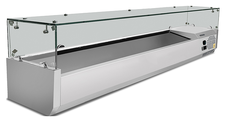 Холодильная витрина Koreco VRX/1500/380 fg предназначена для демонстрации, охлаждения и кратковременного хранения салатов, закусок и ингредиентов для пиццы на предприятиях общественного питания и торговли. Модель оснащена электронным термостатом, 1 ярусом и испарителем, встроенным в стенки ванны. Отверстие в нижней части ванны предназначено для поддержания внутреннего объема в чистом состоянии. Корпус выполнен из нержавеющей стали AISI 201, купол - из закаленного стекла со специальным крепежом. Гастроемкости в комплект поставки не входят. Особенности: