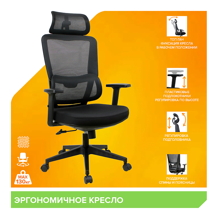 Кресло Everprof Work предназначено для меблировки офисов и современных домашних кабинетов. Модель оснащена регулируемым подголовником, поясничной поддержкой и подлокотниками с 1D регулировкой. Механизм качания ТопГан позволяет легко менять положение тела, фиксировать кресло в рабочем режиме или использовать его в режиме свободного покачивания. Подлокотники с 1D регулировкой обеспечивают поддержку рук и правильное положение тела за рабочим столом. Ролики для паркета гарантируют надежность и защиту напольного покрытия. Крестовина и подлокотники выполнены из пластика, набивка - из вспененного полиуретана, обивка - из сетки. Особенности: