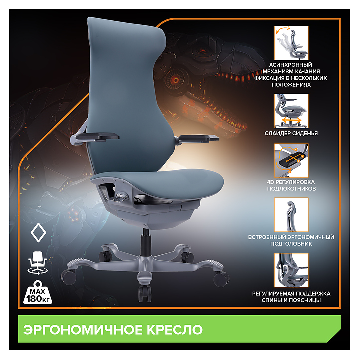 Кресло Everprof Atom предназначено для меблировки офисов и современных домашних кабинетов. Модель оснащена сиденьем с механизмом изменения глубины, поясничной поддержкой и подлокотниками с технологией T-REX для регулировки в 4 направлениях. Спинка с интегрированным подголовником плавно повторяет анатомический изгиб позвоночника, обеспечивая комфортную посадку без лишнего напряжения. Передняя часть сиденья слегка наклонена, что устраняет давление на ноги. Асинхронный механизм качания 1:3 позволяет независимо отклонять спинку и сиденье, а также фиксировать нужное положение. Ролики для паркета гарантируют надежность и защиту напольного покрытия. Крестовина и подлокотники выполнены из алюминия, обивка - из экокожи. Особенности: