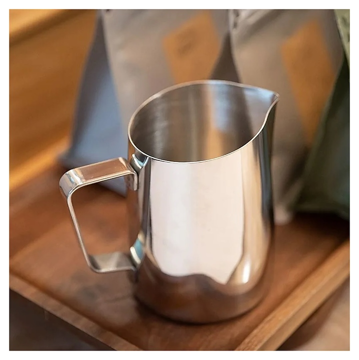 Питчер Restopit рп783 Pro предназначен для подогрева и вспенивания в нем молока в процессе приготовления капучино, латте и других кофейных напитков на предприятиях общественного питания и торговли, а также в домашних условиях. Модель оснащена интегрированным в борт изливом, скошенной кромкой, мерной шкалой с внутренней стороны и рукояткой с удобным захватом. Изделие выполнено из нержавеющей стали марки 304 с серебристой поверхностью. Дополнительные характеристики:
